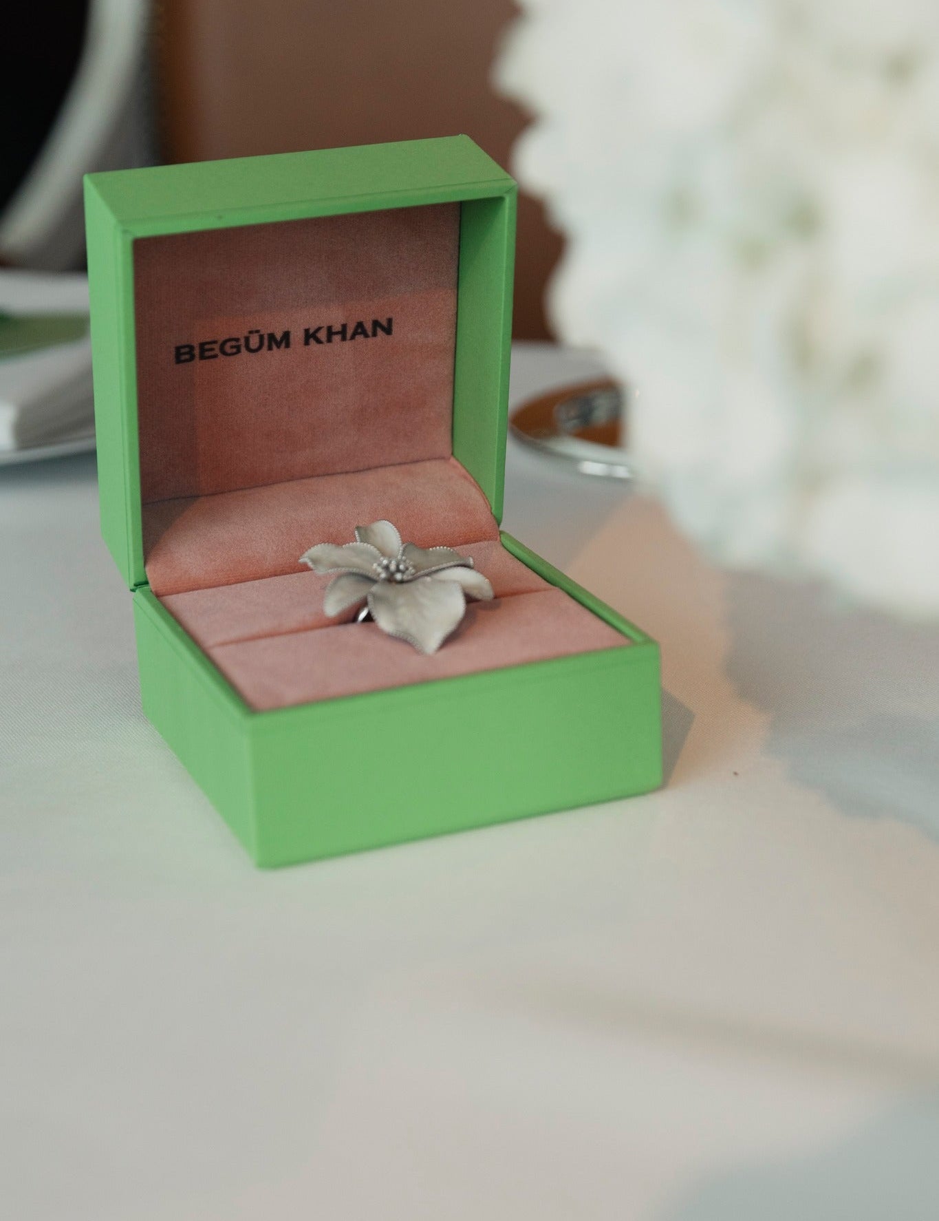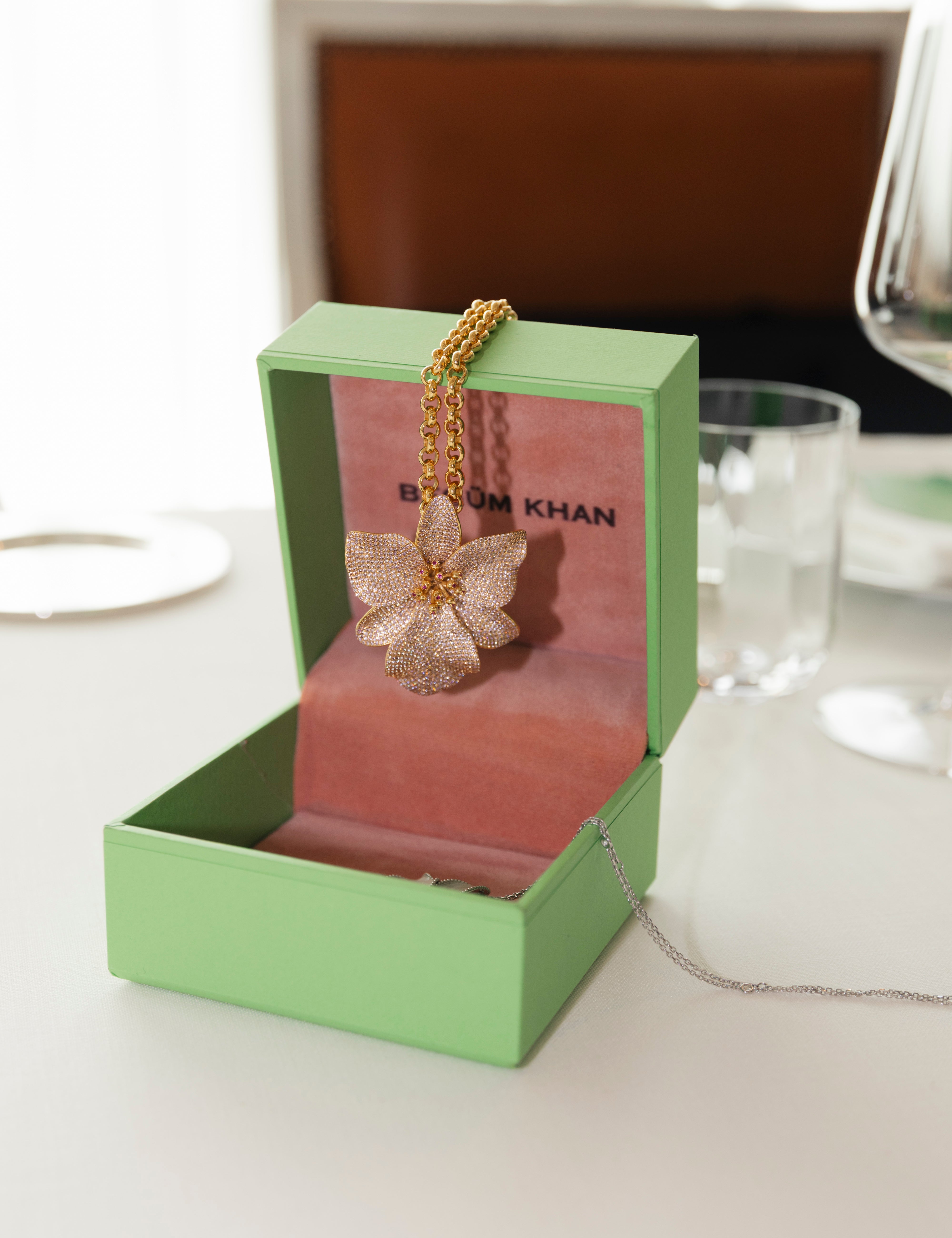 El işçiliğiyle tomurcuklara yerleştirilen pırlantalar, altın kaplı yapraklar ve sedefli mineyle geçmişin ruhunu taşırken modern bir zarafet sunuyor.